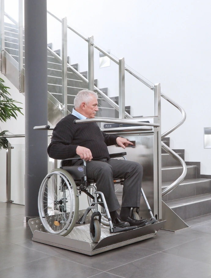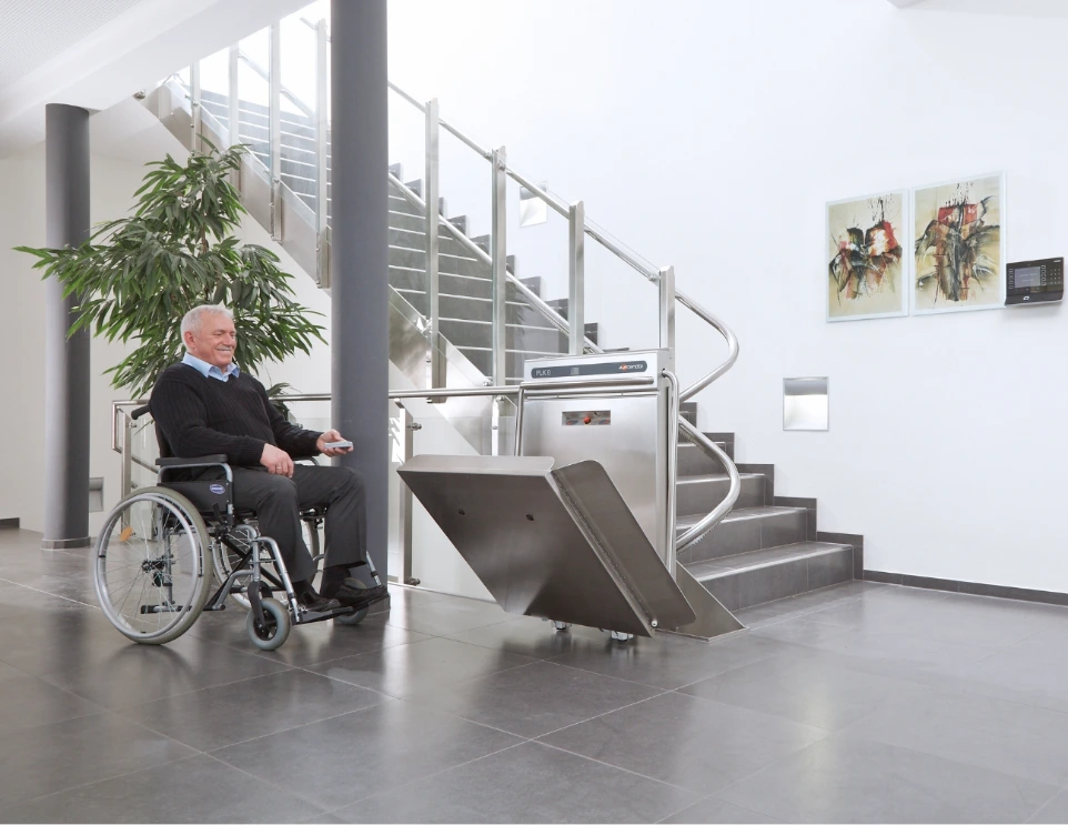 La plateforme élévatrice permet de franchir facilement quelques marches ou un étage, en intérieur comme en extérieur. Elle est particulièrement adaptée aux personnes en fauteuil roulant et s'intègre à votre environnement
