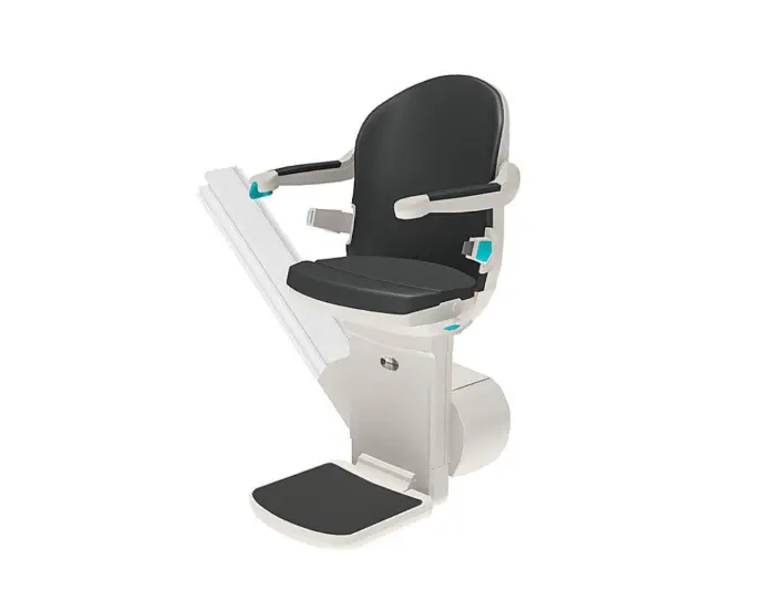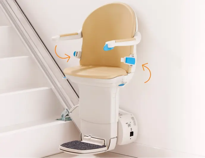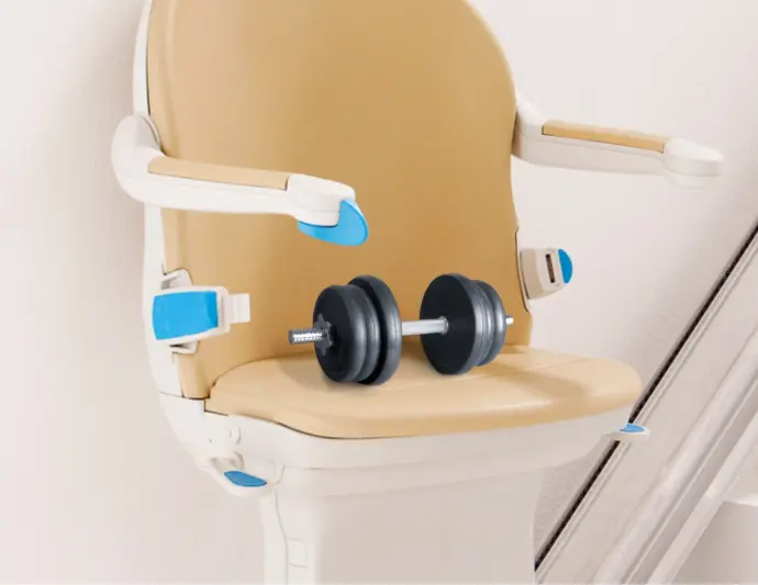 Le monte-escalier Handicare 1000 est doté de plusieurs caractéristiques de sécurité, notamment un dispositif de détection intelligent intégré aux accoudoirs, une ceinture de sécurité utilisable d'une seule main et des accoudoirs enveloppants pour assurer votre sécurité tout au long du trajet.